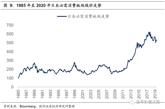 从消费板块的估值水平中,也可以看到,日本消费板块的市盈率并没有在长期低利率环境中出现明显的趋势性上行,即使在2012年到2017年的消费股大行情中,市盈率也仅仅出现了小幅上行并且再度回落。日本消费股并没有因为低利率而出现「生拔估值」的行情。