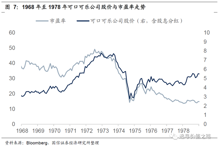 但是可口可乐公司的估值从1973年高点的市盈率大致50倍不到,一路下滑到1978年的15倍左右。估值的大幅下滑使得公司的股价在后面很长的时间里一直都没有超过1973年时的高点,虽然公司的净利润在1974年到1978年几乎翻了一倍。