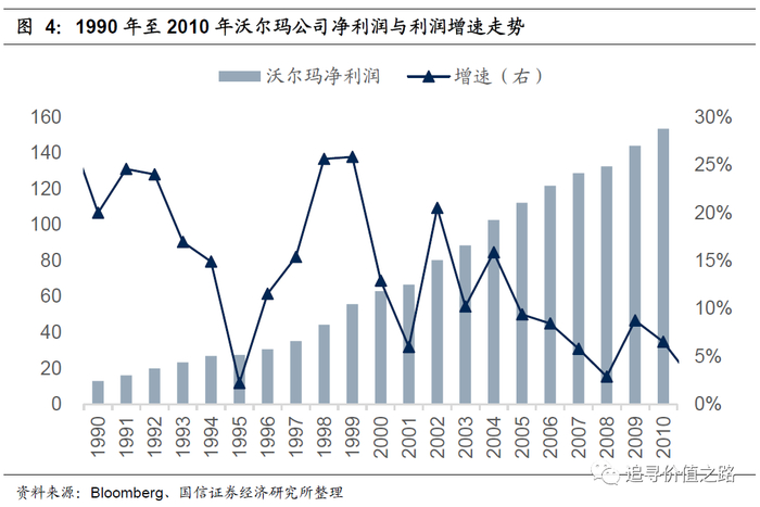 从业绩增长情况来看,沃尔玛的表现确实非常不错,下图报告了沃尔玛公司从1990年到2010年二十年里的净利润以及净利润增速。我们可以发现,公司的净利润是在持续增长的,而且增长的趋势非常稳定优美。2000年以前,公司的平均增速可以高达20%,2000年至2005年间,公司的业绩增速平均有15%,2005年后业绩增速平均有5%到10%。