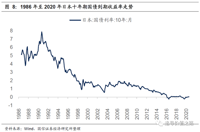 1990年以后的日本利率水平变化,大体上可以分为这样几个阶段:第一阶段,从1990年到1998年,利率水平大幅快速下降,十年期国债到期收益率从8%下降到1%左右;第二阶段,从1998年到2008年,十年期国债到期收益率维持在1.5%左右;第三阶段,从2008年到2016年,利率水平再度下降,从1.5%下降到0%附近;第四阶段,2016年至2020年,利率水平维持在0%附近。