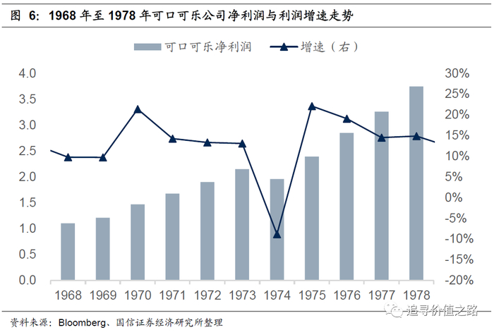 相似的例子还有70年代美国「漂亮50」时期的可口可乐公司,从下图中可以清晰地看到,在整个70年代,除了1974年因为石油危机导致的经济衰退,可口可乐公司的净利润每年都在增长,企业的盈利增长速度15%左右。可口可乐公司的盈利增长曲线几乎堪称完美。