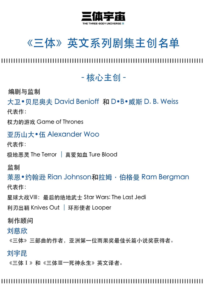 通过《三体》美剧官宣的主创团队配置来看,Netflix真的是有下血本准备大干一场,编剧监制是《权力的游戏》主创的大卫·贝尼奥夫和D·B·威斯,以及《极地恶灵》的亚历山大·伍。除此之外还包括执导过《星球大战·最后的绝地武士》《利刃出鞘》的莱恩·约翰逊和拉姆·伯格曼,而制作顾问则是由原作者刘慈欣以及英文译者刘宇昆担任。