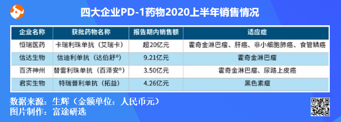 国内情况:据相关数据统计,2020 上半年恒瑞医药、信达生物、百济神州、君实生物这四家药企的PD-1药物销售额已超35亿元。