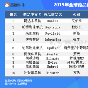 近日,FiercePharma公布了2019年全球药物销售额榜单Top 10。由下图可得,在Humira之后的则是一系列超级抗肿瘤药物,前10名的药物销售榜单里有6个是抗癌药物: