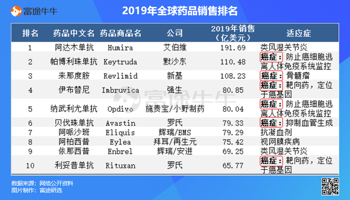 血管内皮生长因子抑制剂,就是针对癌症组织有血管丰富的特点,抑制血管生长,也就抑制了肿瘤的生长。从2019年的全球Top10药品销售情况,我们得知血管内皮生长因子抑制剂有罗氏的贝伐珠单抗,排第六名。