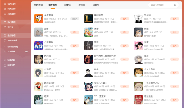 鱼吧主要分为三大类,一类是“主播吧”,是主播粉丝们日常获取主播动态、分享主播八卦的聚集地,促进主播与粉丝、粉丝与粉丝间的强关联及强互动;一类是“游戏吧”,是基于各类主流热门游戏、热门电竞赛事,形成以电竞为核心的游戏社区;还有一类是“兴趣吧”,是通过延展用户兴趣标签,为用户打造的多元化的兴趣社区。