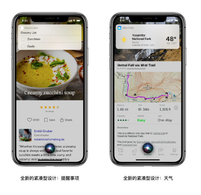 在iOS 14中,Siri采用了全新紧凑型设计,不会占用屏幕太多的空间。当你向它提问时,Siri会在屏幕底部待命,回答的内容则会以通知的形式显示在屏幕上方。按照苹果官方的说法,与三年前相比,Siri的知识量增加了20倍,而且语言表达也会更自然,这些都要归功于设备端的智能技术。