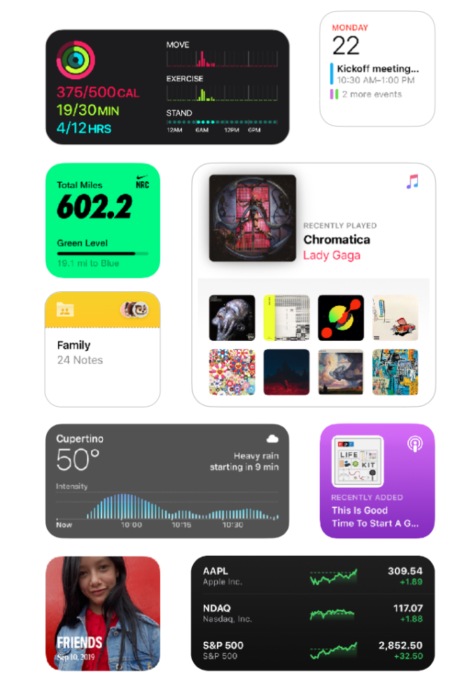 与以往的系统相比,iOS 14的主屏幕会更具个性和实用性。现在,你可以使用全新设计的小组件来定制你的主屏幕,通过设备上的智能技术,系统会在适当的时机让你看到合适的小组件。也就是说有了设备上的智能技术,系统会根据时间、地点、活动等因素,将适合你使用的小组件在适当时机进行显示。