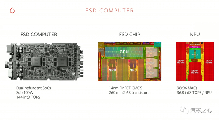除了在车载软件和训练服务器端变革,特斯拉在车载硬件端也做好了准备,就是其自研的 FSD 芯片。