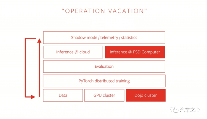 在评估层之上,是云端推理层和车端 FSD 芯片推理层,到这一层,意味着算法模型走完了大部分流程,然后就是部署到车端;