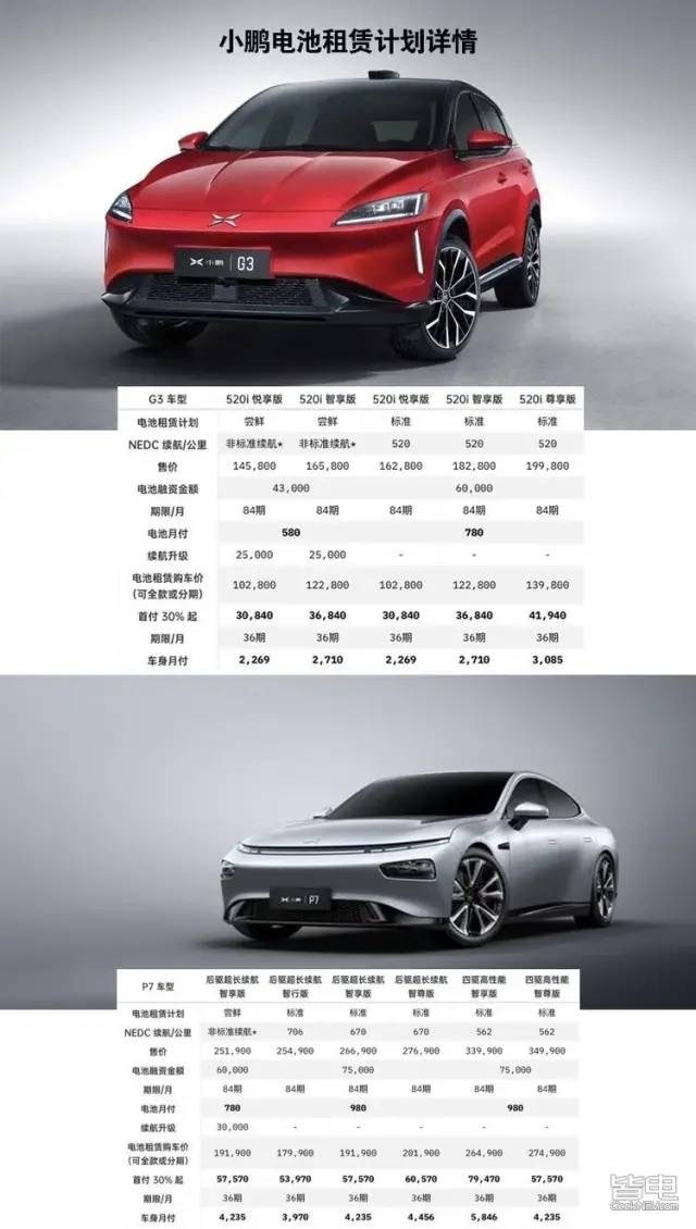 尝鲜版的电池租赁计划,P7 和 G3 车价降低了 6 万和 4.3 万,P7 84 期每期需要支付 780 元,G3 84 期每期需要支付 580 元。