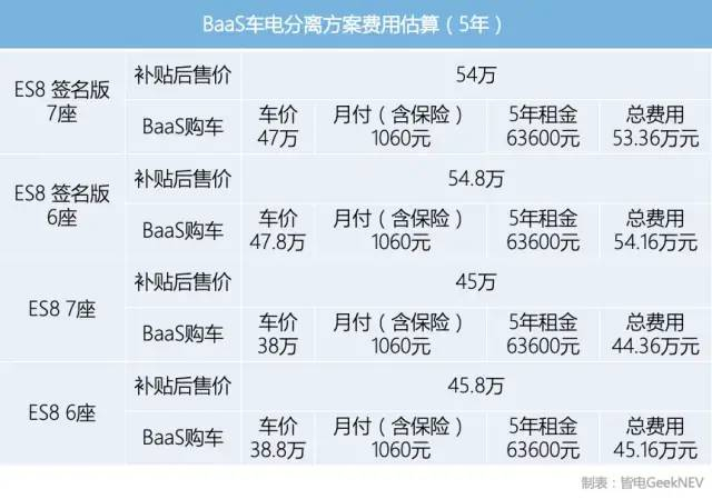 先来看看蔚来汽车的BaaS服务,在BaaS方案中,蔚来全系车型在原来售价的基础上降7万元,用户购车后只需要每个月支付 980 元的电池租用费。如果没有购买电池无忧服务还需要缴纳80元/月的保险费,也就是每个月需要缴纳1060元就可以用车了。