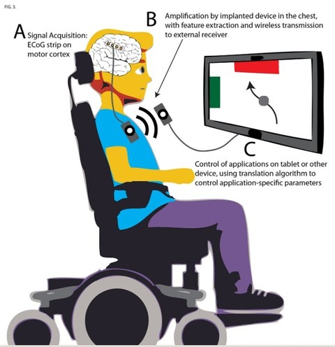 A:从植入的ECoG电极条获取信号。B:大脑信号被植入胸部的装置放大了。对原始电压进行基本信号处理以提取信号特征。特征值通过无线传输到外部接收器。C: 使用平板电脑,特征被映射到通信和导航应用程序的控制功能上。图片来源Kai J. Miller。
