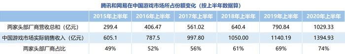 另外,单拎出腾讯和网易的市场份额来看,这两者的占比亦持续走高。自2015年上半年至今,这两家头部厂商的市场占比从49%提升至74%,其中网易的2019年中报营收同比大涨逾130%。