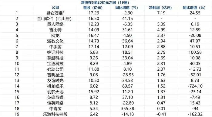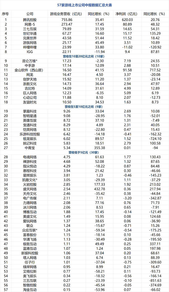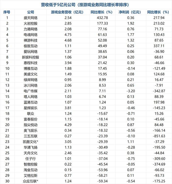 二、尾部公司堪忧:一半的游戏上市公司营收不足5亿元,13家营收同比下滑