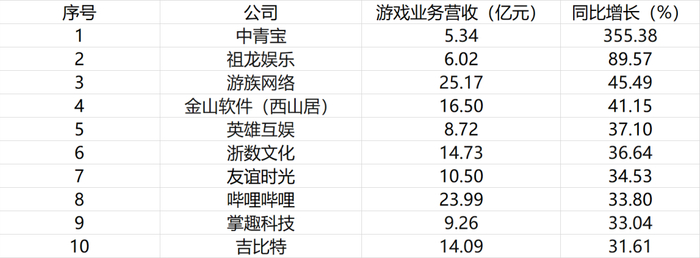 在这五家头部大厂之外,上半年营收在5亿元以上的厂商也有一些可圈可点,营收同比增长的厂商共有10家,分别是游族网络、哔哩哔哩、金山软件(西山居)、浙数文化、吉比特、友谊时光、掌趣科技、英雄互娱、祖龙娱乐以及中青宝。