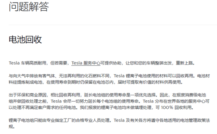 近日,特斯拉官方宣布,特斯拉电池回收服务上线,所回收的锂离子电池组将由“指定工厂”进行处理并回收再利用,承诺做到废弃电池不做填埋处理。特斯拉表示,分布在世界各地的服务中心可以处理不再满足客户需求的任何电池,实现100%回收利用。