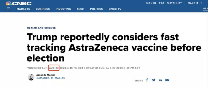 特朗普政府已同意向阿斯利康疫苗项目资助12亿美元,并提前预定了3亿剂疫苗。此前,美国消费者新闻与商业频道(CNBC)在一篇报道中称,特朗普政府曾考虑在大选日之前,对阿斯利康这支疫苗进行紧急使用授权,以便能够在美国使用。