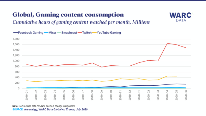 图注:2020 年 7 月,全球各大平台游戏内容的消费时长(来源:WARC DATA)