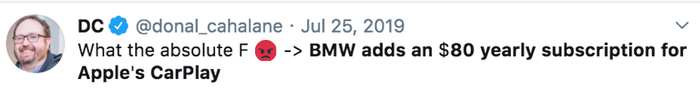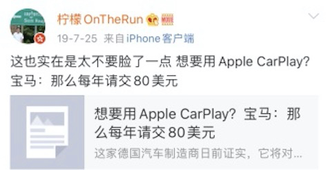2019年,宝马将车载系统Apple CarPlay由一次性付费改成了按年订阅,首年免费使用,以后每年按年费80美元收费,如果车主不缴费,则会关闭这项功能,此举顿时引发疯狂吐槽。