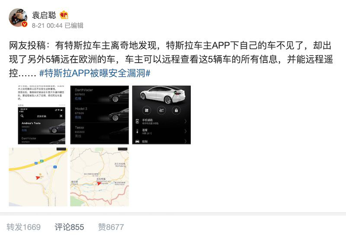 今年8月,一位特斯拉中国车主在使用特斯拉APP时就突然发现,他绑定成功的车辆成了5辆远在欧洲的陌生车辆,他可以在APP中查看这些车辆的所有信息,还能使用APP远程控制解锁车门、打开车窗、开启空调等。