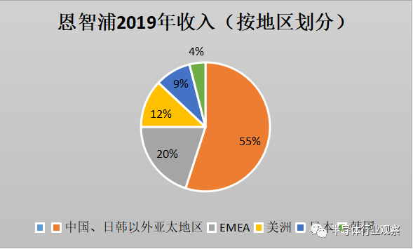 另外,2019年,恩智浦有超过一半的收入来自中国和除了日韩以外的亚太地区,两成的收入来自EMEA,美洲和日本各占约一成,韩国不足5%。可以看出,中国市场对恩智浦的贡献已占据举足轻重的地位。