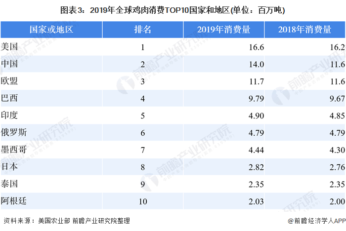 按照美国农业部预测数据,2019年鸡肉生产的主要国家和地区有美国、中国、巴西、欧盟和俄罗斯等,其中美国以19.8百万吨的产量位居第一;而中国则以13.8百万吨的产量超过巴西、欧盟位居第二。此外,大部分鸡肉消费大国同时也是鸡肉生产大国,基本上可以满足自产自销。