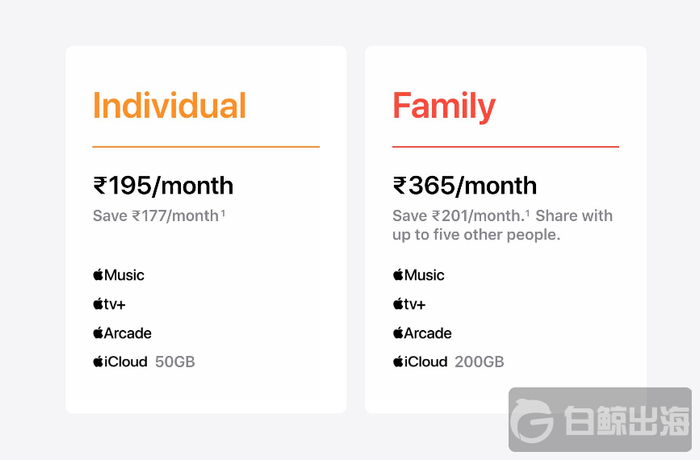 另外,苹果还针对不同的市场采取了不同的 Apple One 定价策略。比如在印度市场,苹果只推出了个人版和家庭版,售价分别为 195 卢比(约 2.6 美元)和 365 卢比(约 5 美元),比美国区价格低很多。
