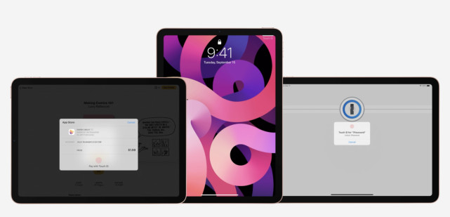 新iPad Air 4采用10.9英寸的liquid视网膜显示屏,屏幕采用全层压显示屏,拥有广色域显示,原材显示,以及反抗涂层。此外,新品的屏幕分辨率为2360*1649,像素超过380万。此外,新iPad Air 4为全面屏设计,支持触控ID,但是将其集成到顶部按钮,在这枚按键上集成了目前最小的认证传感器,能够快速识别指纹。