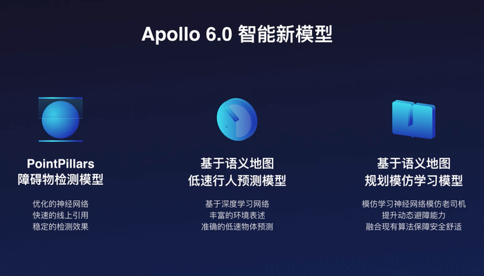百度Apollo6.0包含3款深度学习智能新模型,包括PointPillars障碍物检测模型,基于语义地图低速行人预测模型和基于语义地图规划模仿学习模型。与以往不同的是,6.0系统对云服务进行了全面升级,推出了许多可以串联的云服务,在云端处理更为复杂的任务。