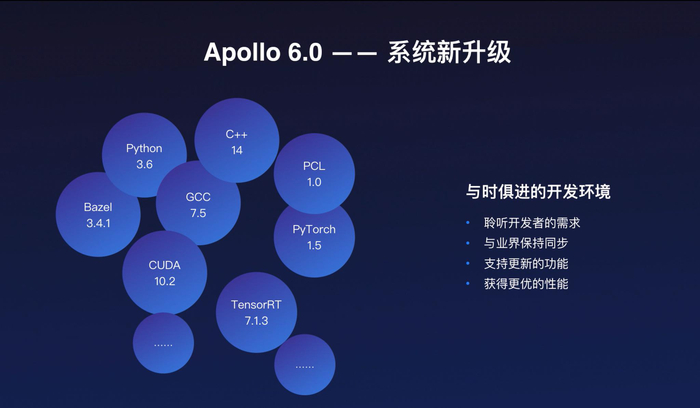 针对研发者的需要,Apollo6.0将主要的编程工具、依赖库都升级到了最新版本。包括C++14、Python3.6、Bazel3.4和GCC7.5等,使Apollo算法有了更优的性能。