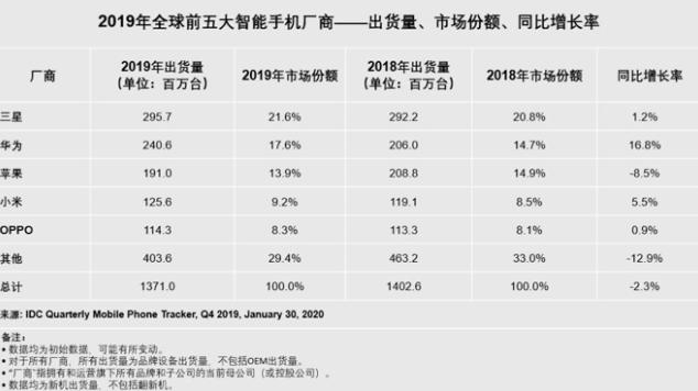 2019年全球前五大智能手机厂商排行