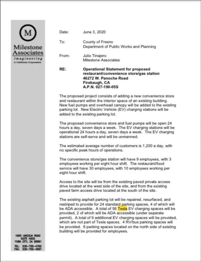 根据弗雷斯诺县当地规划部门提交的表格显示,该充电站将拥有56个超级充电桩,这是以往都不具备的充电站规模。