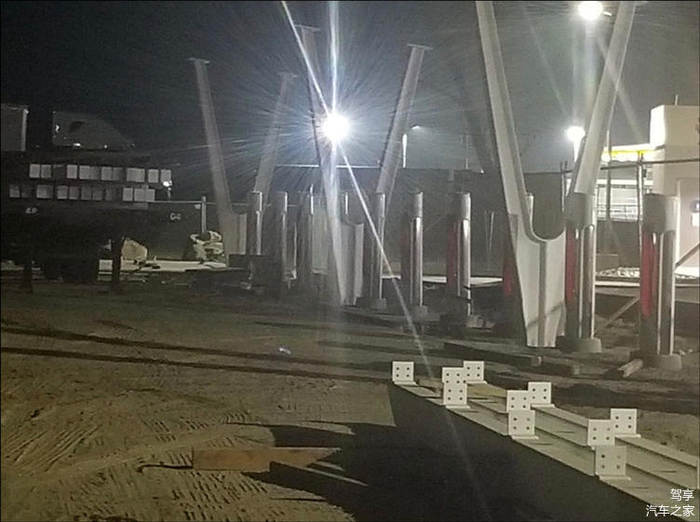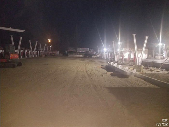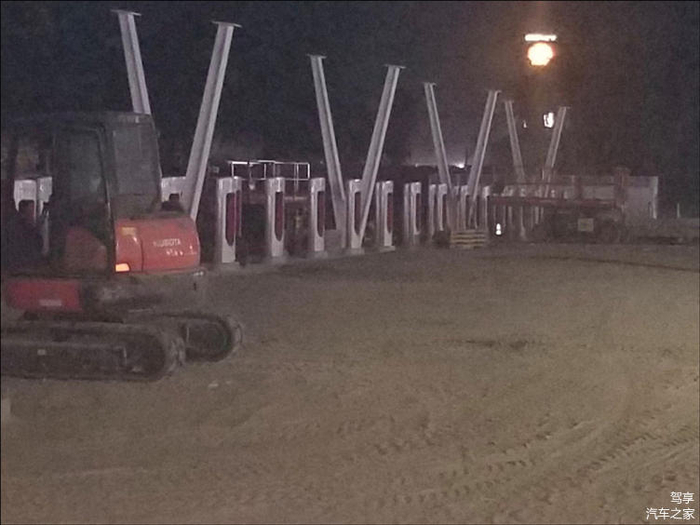 不过,根据这位网友分享的照片发现,该超级充电站还在建设中,目前在完成前期的施工过程,充电站周边显得比较狼藉,灰尘满满。
