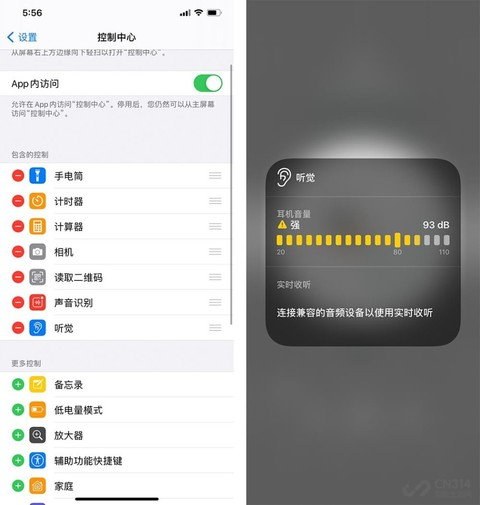 有些人听歌喜欢把手机的声音开得特别大,这样很容易损害自己的耳膜,从而影响听力,于是苹果在iOS 14的控制中心中加入了一项听觉功能。它会记录你耳机音量,以确定分贝值是否处于合理范围内,当显示会绿色代表音量合适,当显示为橙色,代表声音太大,可以将耳机的音量调小一些。