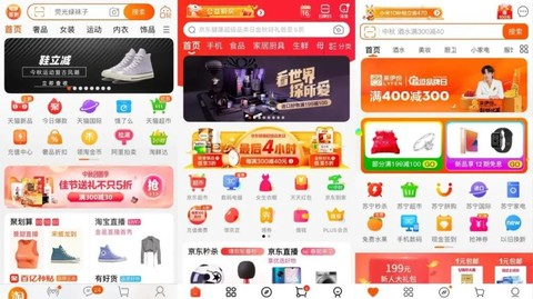 (从左至右,依次是未改版前的淘宝、京东和苏宁易购首页)