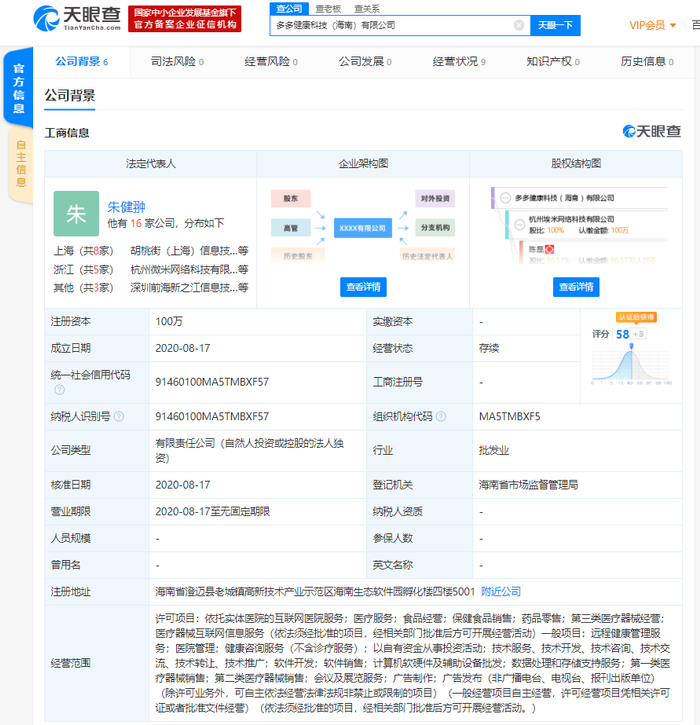 一个月前,上述拼多多关联公司还在海南澄迈县设立了一家公司——多多健康科技(海南)有限公司,法定代表人同为朱健翀,经营范围包括依托实体医院的互联网医院服务、医疗服务、食品经营、保健食品销售、药品零售、第三类医疗器械经营、医疗器械互联网信息服务等。