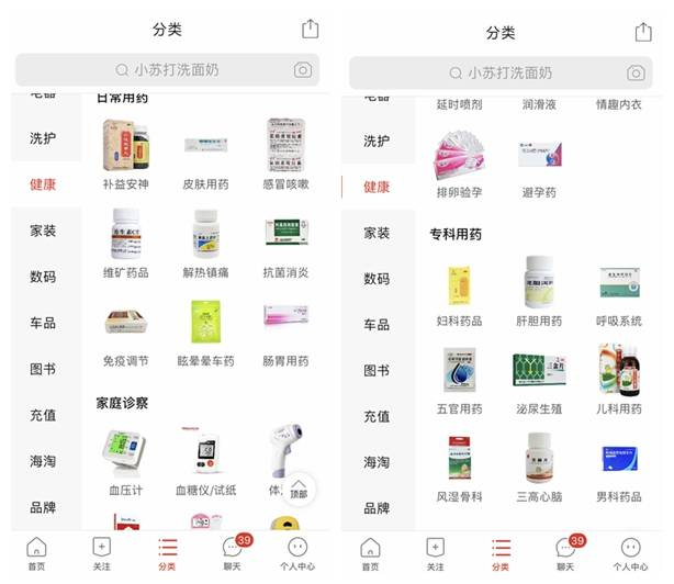 去年10月初,亿欧大健康曾报道过拼多多在医药电商方面的布局(详情见文章《拼多多的医疗野心》),其于2018年上线健康频道,此前多集中在OTC、医疗器械、医疗保健等品类,到现在,其健康频道已经拓展到计生情趣、专科用药、保健护理、日常用药、家庭诊察、理疗器械、康复辅助、隐形眼镜、医疗服务等九大子类目。