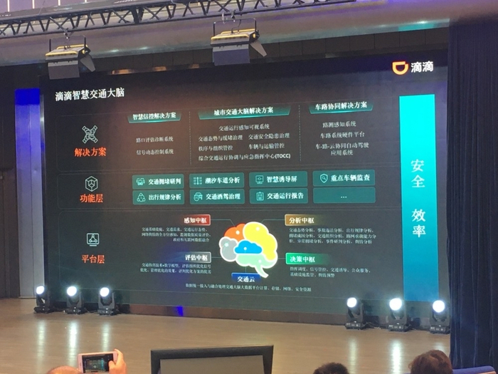 张博也简单介绍了滴滴智慧交通,分为三层,平台层对整个包括交通云和感知、分析、决策、评估四个中枢,在平台层上包含若干个核心能力的功能层,功能层之上有智慧信控、城市交通大脑、车路协同等三个解决方案。