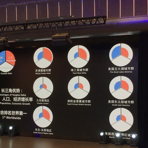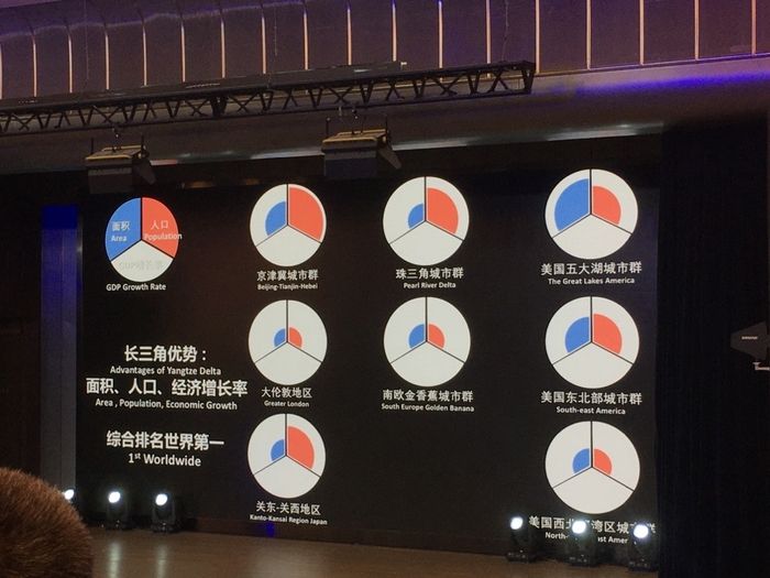 吴院士认为,城市化发展中,大致呈现这样的内容:“中国大概最后落到三群,一个是京津冀,一个是长三角,一个是珠三角;美国就是两群半,最后五大湖肯定要死亡。东北还有西海岸;欧洲有一圈,专业上称为金香蕉,伦敦有一圈,关西到关东。”从面积、人口GDP的关系来看,可以看到十大圈中,长三角占了非常大的位置。