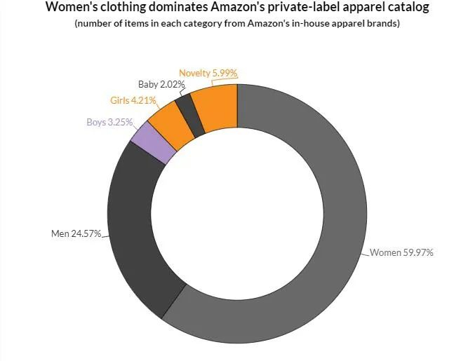 在服装和配件(不包括行李和其他旅游相关物品)中,女性商品占亚马逊自有品牌11995件商品的60%,男装占总数的四分之一。