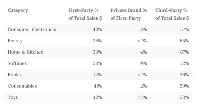 但是,亚马逊的自有品牌只占不到总上市量的1%。根据数据,除图书类别外,第三方市场占所有列表的90%以上。