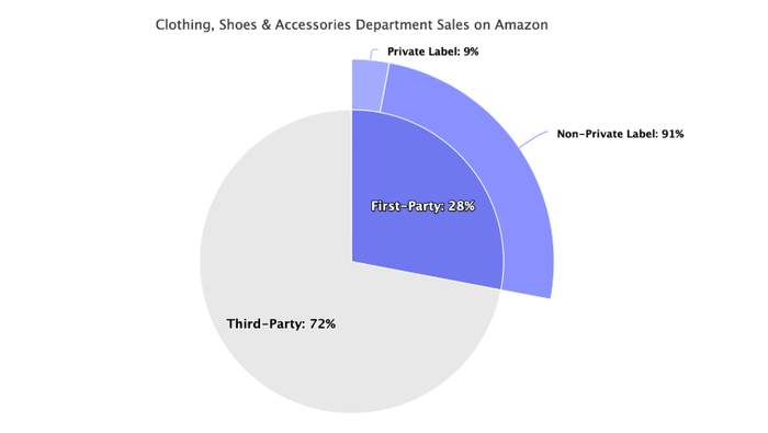 从图中发现,在亚马逊服装、鞋子和配饰类别的总销售额中,其中9%的销售额来自亚马逊的自有品牌,第三方卖家的销售额则占到了72%。