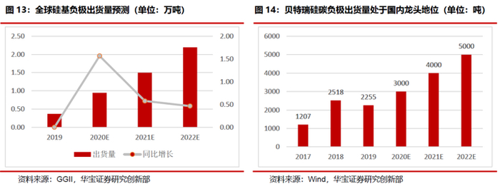 关注有能力推进硅材料负极发展,并获得市场份额的龙头公司。在硅纳米线的产业链方面,A股上市公司中国宝安在新三板上市的子公司贝特瑞的硅碳负极较早实现产业化,贝特瑞的硅碳负极产品技术和量产出货能力在国内处于领先低位。2013 年贝特瑞通过三星认证并开始批量出货,公司同时供应松下、LG、三星,并已进入特斯拉供应链,是特斯拉核心供应商。目前公司硅碳负极已开发至第三代产品,比容量从第一代的650mAh/g 提升至第三代的1500mAh/g,正在开发第四代硅碳负极材料产品;硅氧负极部分产品比容量达到1600mAh/g 以上。公司硅基产品具备高容量、低膨胀和长循环的特点,技术领先国内同行 2-3年,目前硅基负极产能 3000 吨。此外南天信息参股的公司盈富泰克也投资了Amprius。杉杉股份、正拓能源等具备了生产能力,江西紫宸、星城石墨、斯诺等也都在积极推进硅碳负极的产业化,各自也有产品。
