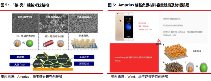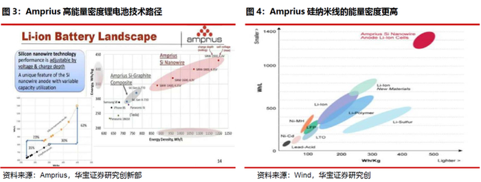 硅基负极材料能量密度高,并成功克服材料膨胀问题。硅基复合材料的高容量特性使其成 为学术界和产业界的关注重点,硅来源广泛,原材料价格便宜,其能量密度相比石墨类负极具有压倒性优势从而有助于实现电池减重,但其大规模推广应用受成本、技术及硅膨胀等问题制约。Amprius Inc.制备的“核-壳”硅纳米线结构成功的克服了硅膨胀,容量450-500mAh/g(和我国公司贝特瑞的产品性能相近,但是未给出量产信息)。其专利中有0.5C-1050mAh/g,循环寿命500次。公司于2013年开始供货,是硅负极高能量密度电池的首个商用案例,能量密度可以达到 650Wh/L,比当时的普通的电池的能量密度高出约 20%左右。Amprius中国官网给出的公司硅基负极的性能长期愿景为1000mAh/g。2018年5月22日,Amprius公司完成锂离子电池硅纳米负极生产线制备并投入中试生产。这是世界上第一条、也是唯一一条双面连贯印刷式、高精度、3维纳米线生产线。这条生产线的建成初步实现了高容量硅纳米线负极的规模生产。如果能获得特斯拉和马斯克的垂青及后续大规模投入,无疑将推动硅纳米线技术产业化加速发展。