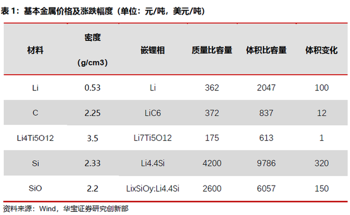 更高的正极比容量、更高的负极比容量和更高的电池电压(以及更少的辅助组元),是高能量密度电池的理论实现路径。正极材料的比容量相对更低,性能提升对电池(单体)作用显著;负极比容量提升对于电池能量密度提升仍有相当程度作用。硅材料的理论比容量远高于(约10倍)已逼近性能极限的石墨,且对锂电压不高,有望成为高能量密度锂电池的负极材料优选。