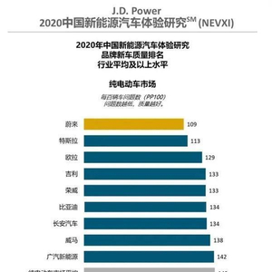近日,全球领先的消费者洞察与市场研究机构J.D.Power(君迪)发布2020中国新能源汽车体验研究。今年是J.D.Power 发布中国新能源汽车体验研究(NEVXI)的第二年,该研究统计和衡量了新能源汽车新车车主在2至6个月的用车期内遇到的质量问题。新车质量以平均每百辆车问题数(PP100)表达,问题数越低,质量越好。