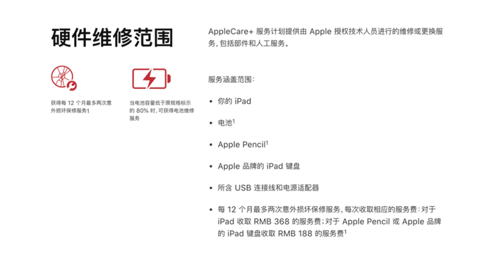 像 iPad 系列大家几乎都不会一出新款就购买,大家都习惯性会用 2-3 年,加上笔和键盘保外维修起来价格也非常昂贵,这个时候就不妨考虑一下 AC+。而且由于政策的改变,也不会担心万一 iPad 配件把两次保外维修机会都用完了怎么办。