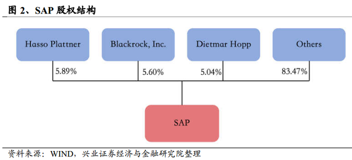 股权结构方面,公司前三大股东分别为Hasso Plattner、Blackrock,Inc.、Dietmar Hopp,持股比例分别为5.89%、5.60%、5.04%。第一大股东哈索博士(HassoPlattner)被誉为“SAP HANA之父”,他与亚历山大.蔡尔(Alexander Zeier)共同完成了HANA系统的最初设计。