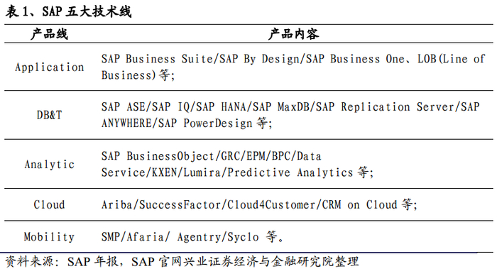 五大技术线支撑强大而完整的ERP系列产品。根据SAP年报及官网披露,公司产品线主要包括Application、DB&T、Analytic、Cloud、Mobility五大产品线,聚焦企业级ERP及子模块产品,目前提供包括ERP财务、CRM与客户体验、网络支出与管理、数字化供应链、HR与员工管理等主要产品。